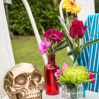 Our get together was more about catching up and seeing what we've all been up to, a bit of a showing off session maybe :) This time of year is crazy busy for those that offer wedding services and so it was nice to take a couple of hours out. We loosely agreed on three table-scapes - a Día de Muertos table bursting with colour, a geometric scape with cute botanicals and a romantic sweetheart table with layers of gold and oppulent blooms. Sioux also needed to get some shots of her amazeballs floral backdrop. The backdrop is really flexible in terms of use but this time, she opted for an ombre carnation drop on invisible line. Lucy also wanted to show off her super cool whiskey trolley, which looked fab with Sioux's ivy based garland.